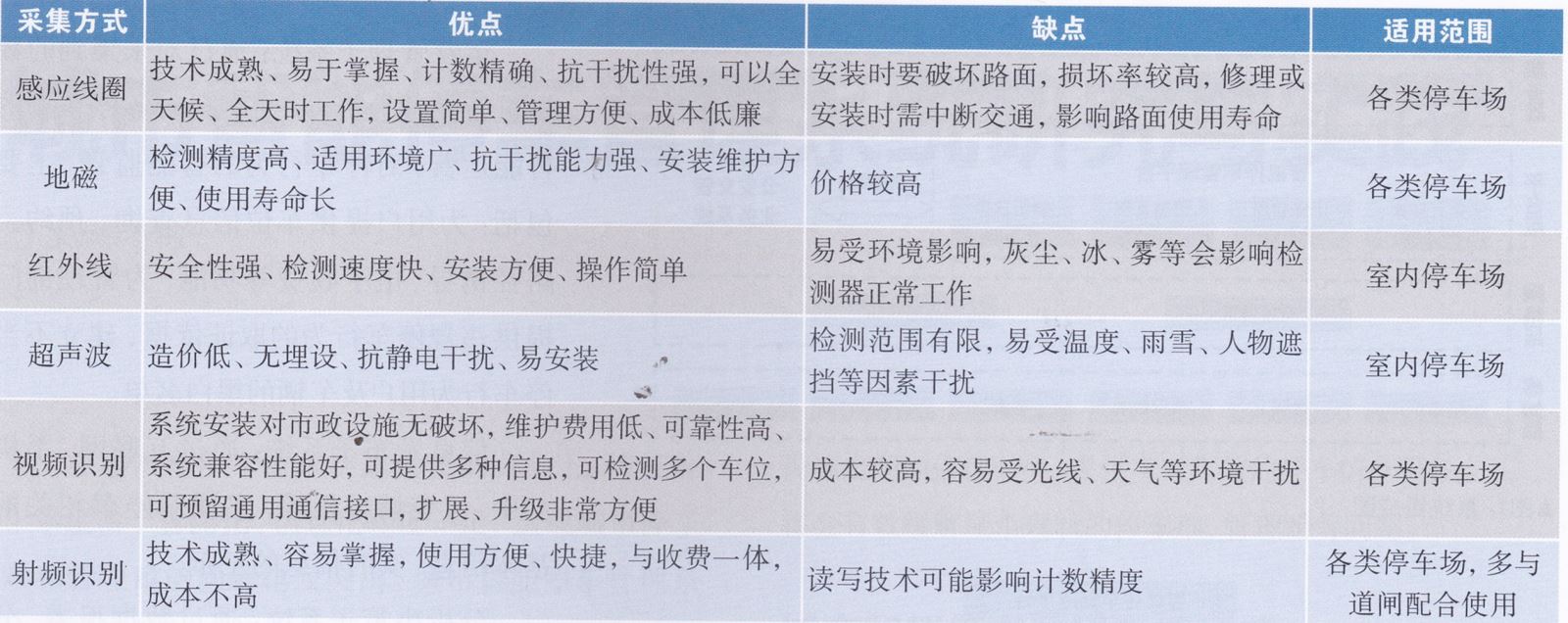 分析決策子系統(tǒng):通過數(shù)據(jù)報(bào)表、分析,對(duì)停車場(chǎng)經(jīng)營進(jìn)行輔助和監(jiān)管,對(duì)車規(guī)劃、政策等提供決策支持城市智能停車管理系統(tǒng)功能的發(fā)揮,很大一部分需要實(shí)時(shí)檢測(cè)數(shù)據(jù)予以支撐。目前,常用的停車場(chǎng)(庫)檢測(cè)終端包括感應(yīng)線圈、地磁、紅外線、超聲波、視頻識(shí)別以及射頻識(shí)別等。綜合比較各種檢測(cè)終端的優(yōu)缺點(diǎn)如下: